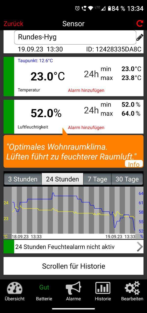 Wird mehrmals täglich das allseits empfohlene Querlüften mit komplett geöffneten Fensterflügeln für 10 – 15 Minuten durchgeführt, so ist das sehr gut in den Auswertungen auf gute Hygrometer zu erkennen.